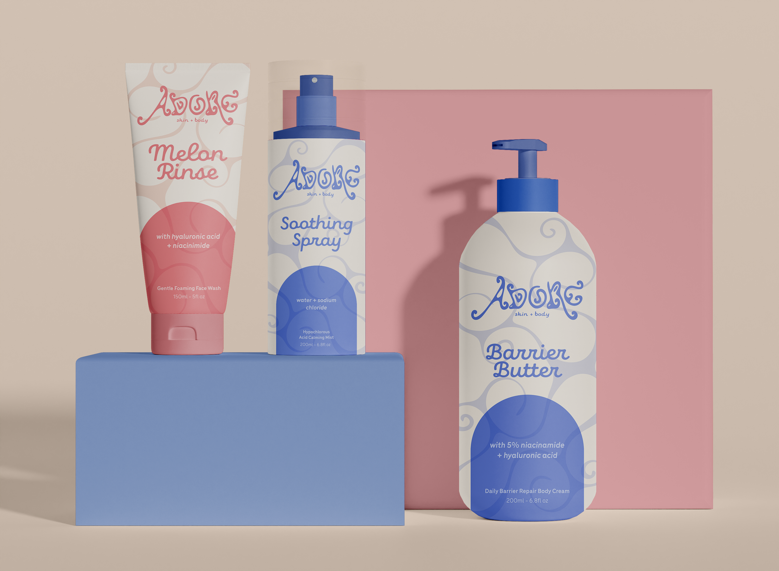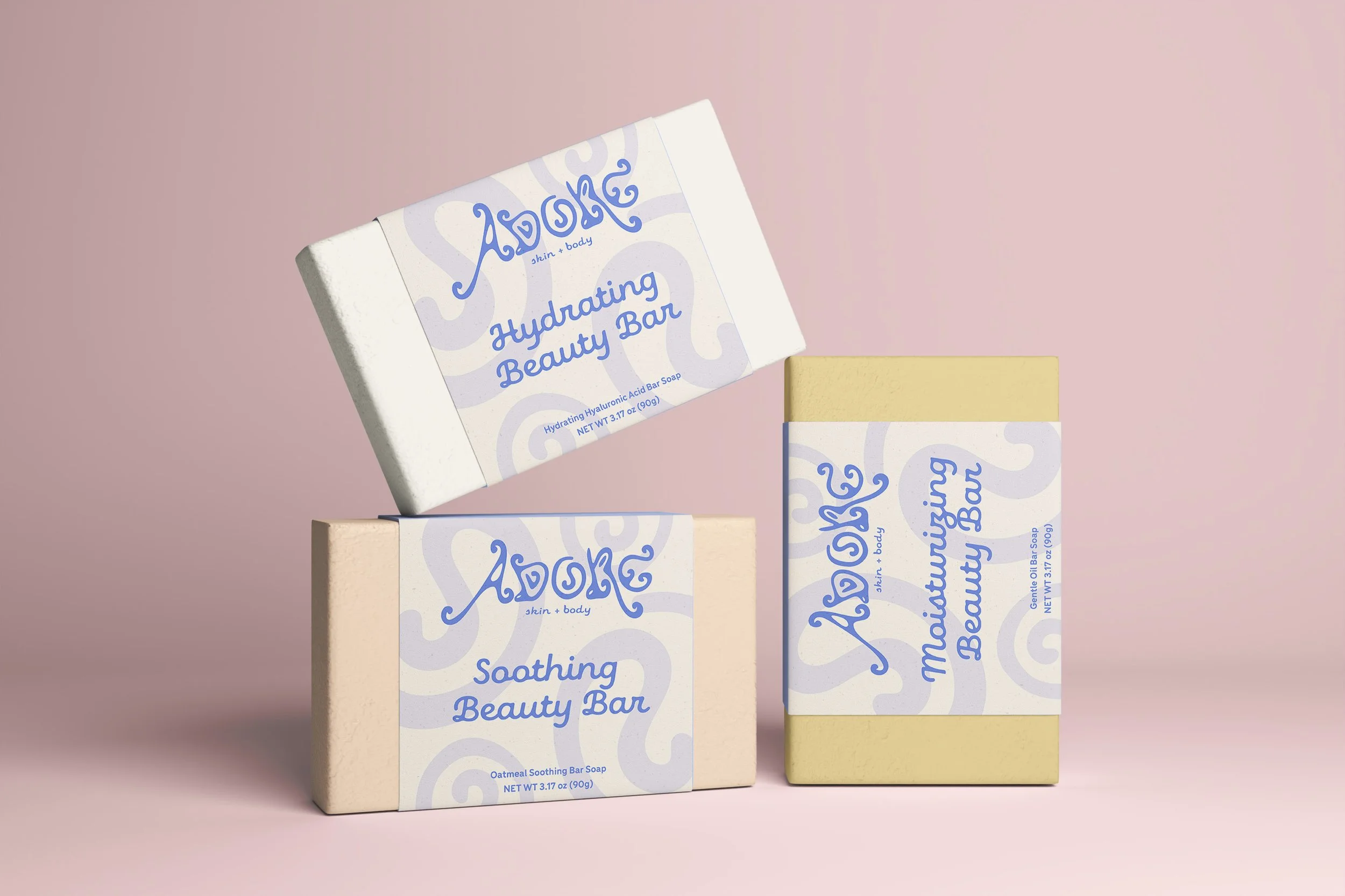 Adore Skin + Body is a conceptual care line for individuals with sensitive and eczema-prone skin. Adore’s logo and color palette were designed to feel playful and cute. Many products for eczema-prone skin use a simple, medical visual identity, so I explored a softer approach. The complimentary packaging text is rounded and fun to echo the logo, and an illustrative swirl was added to further complement the brand.
