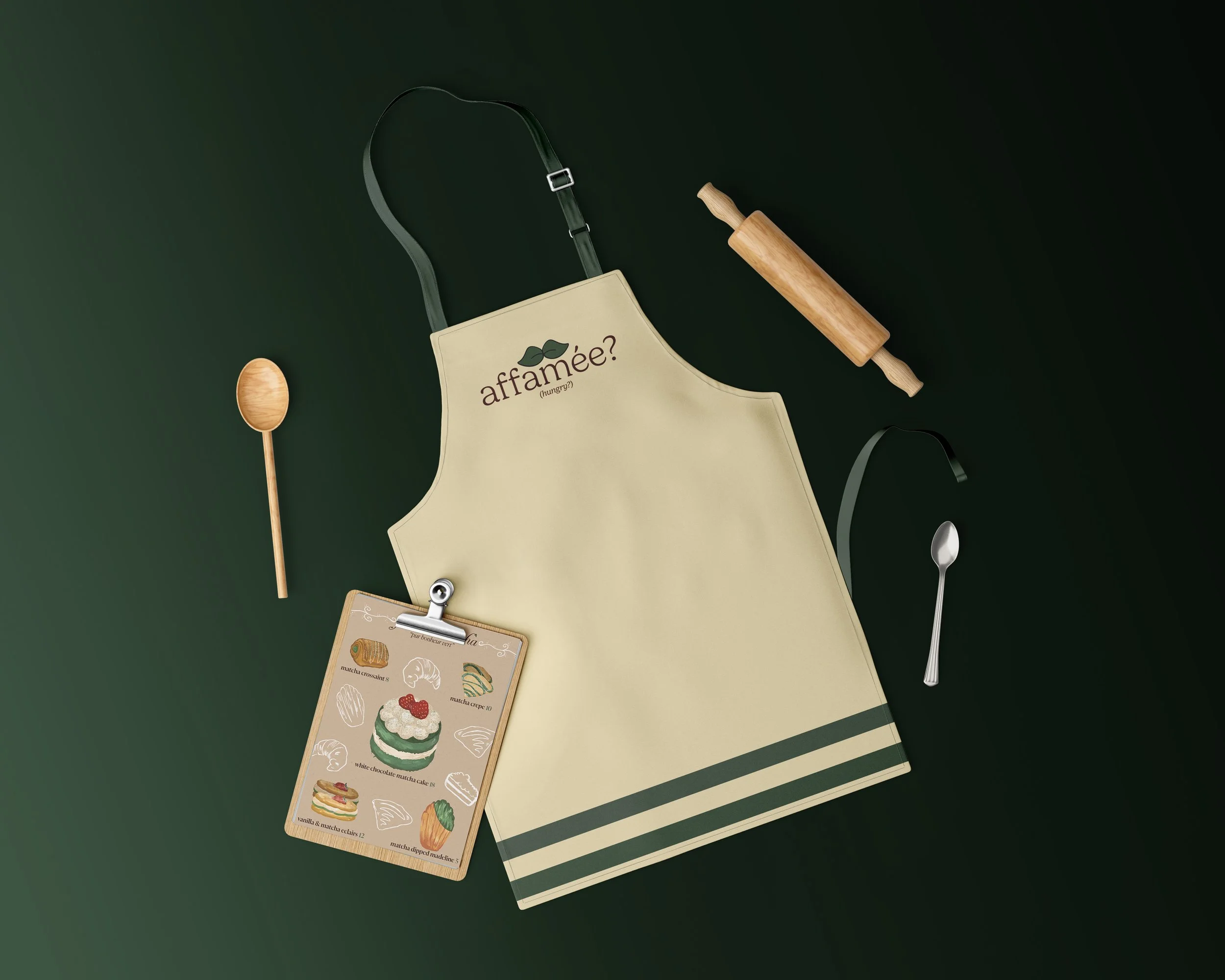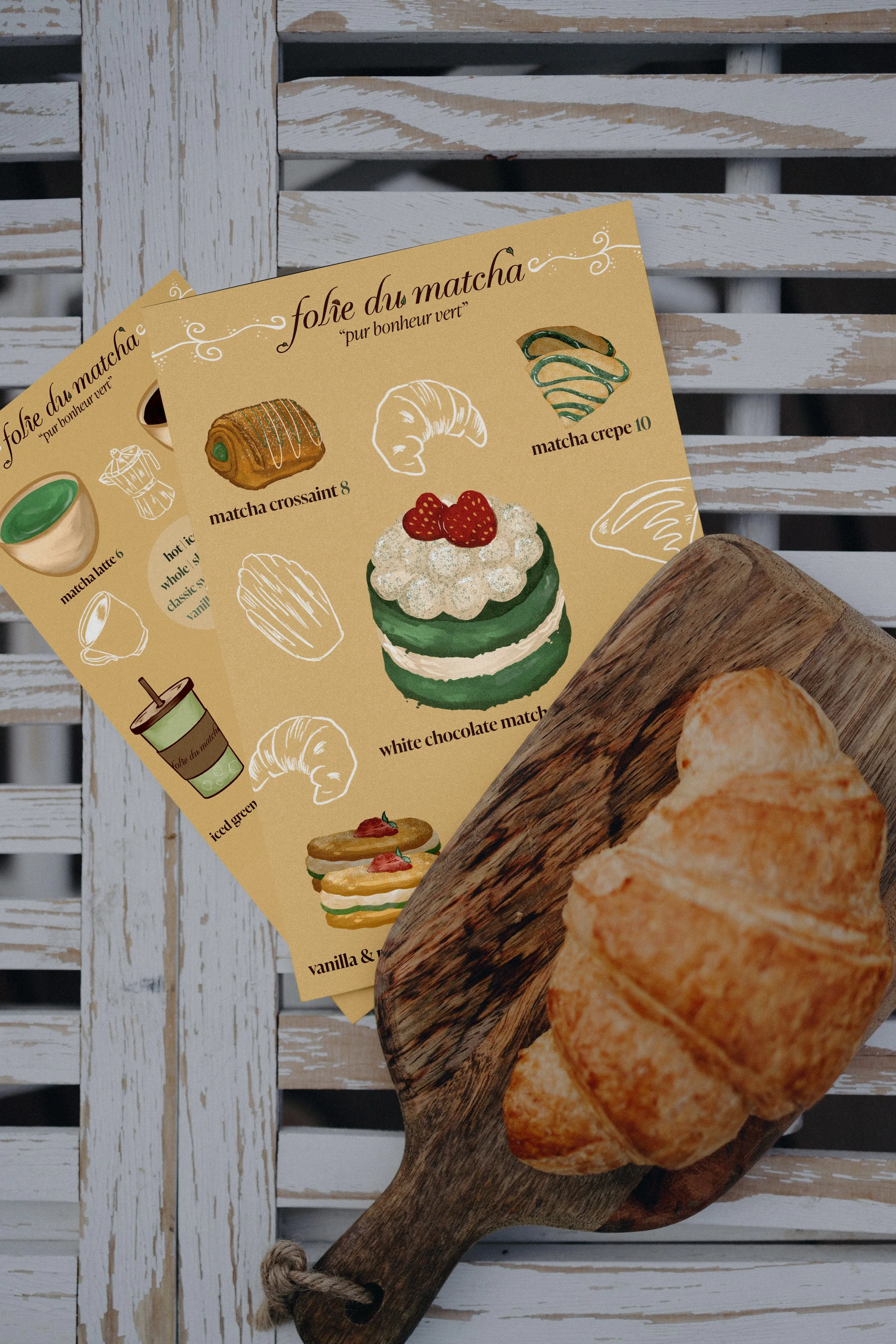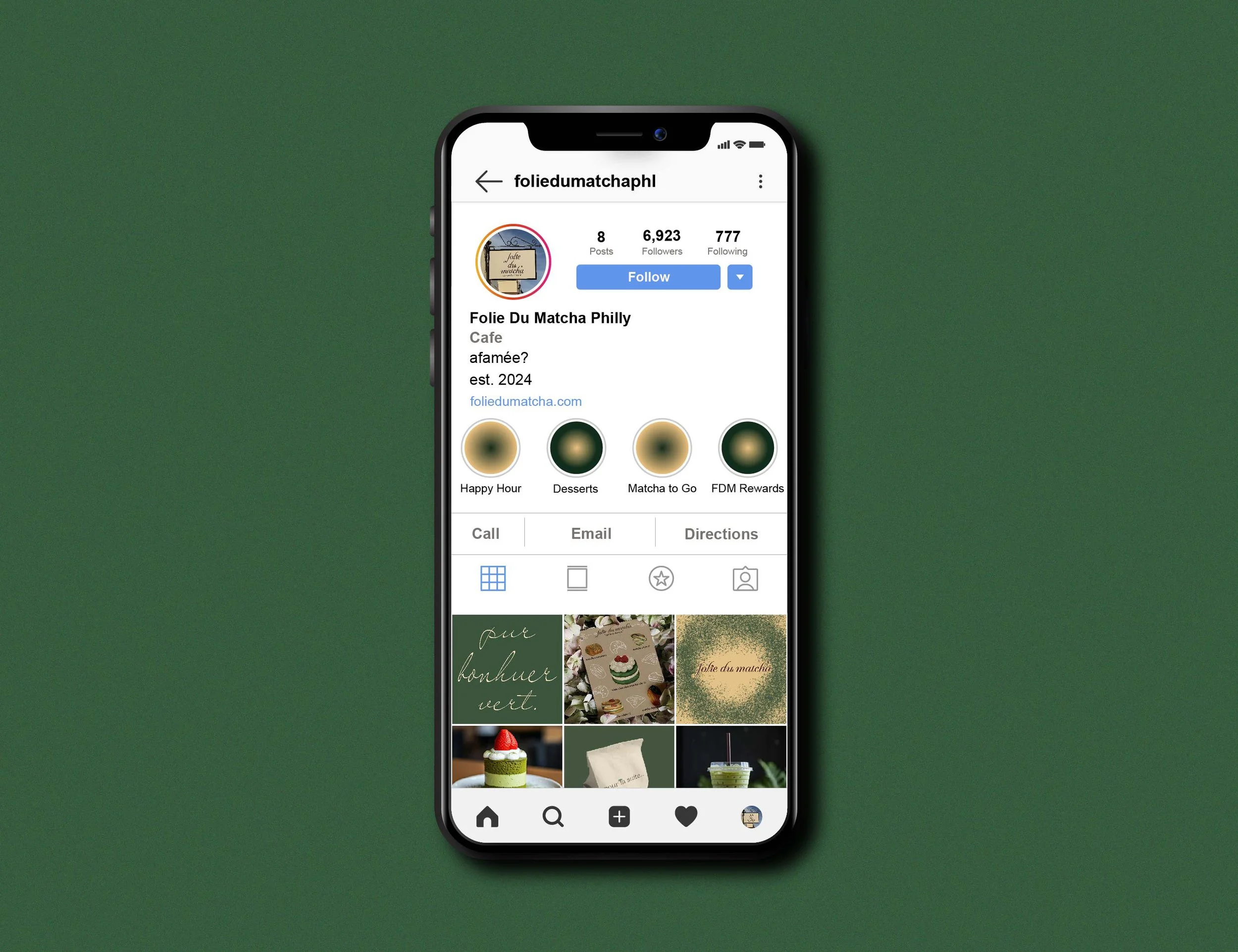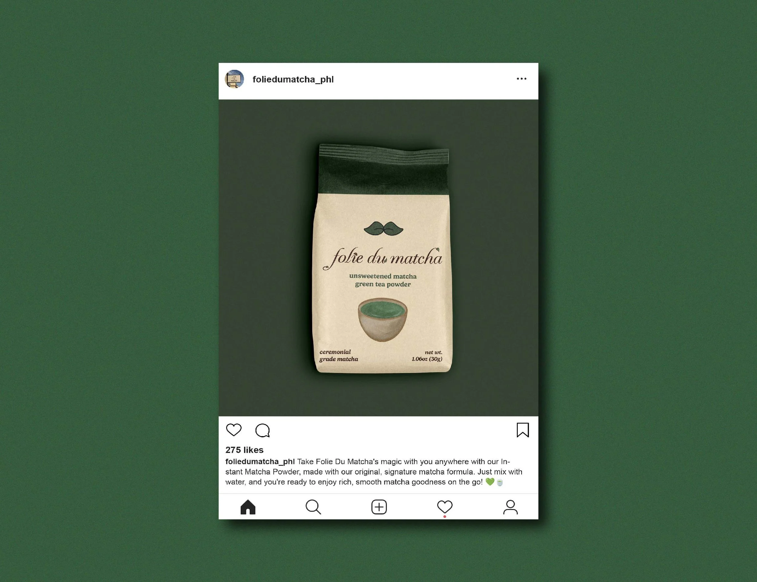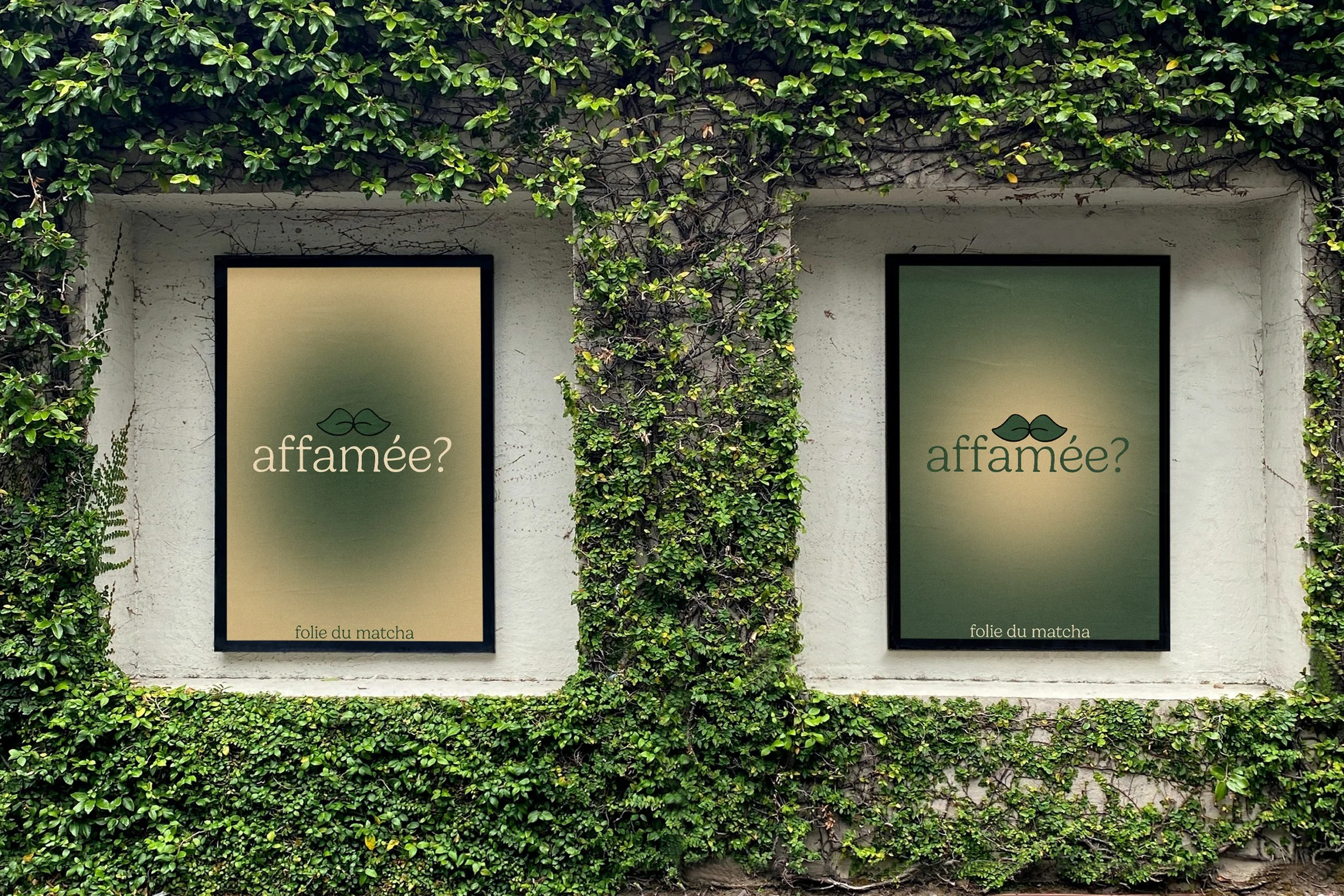The cafe’s socials were designed to maintain a sense of discovery, keeping the in-person experience special. The site and socials follow the same color palette and themes. The advertising was designed mostly through experimentation in Illustrator, which led to the slogan ‘afamée? (hungry?)’. This short, playful phrase reflects the cafe’s purpose of satisfying hunger, while also referencing the French influence of Folie du Matcha.
